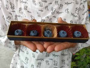 季節外れのブルーベリーを発見しました。ひっそりと2個実を着けていました。発見者のるい君とガンバルばあちゃんで摘み取って食べてみました。甘くておいしかったです。